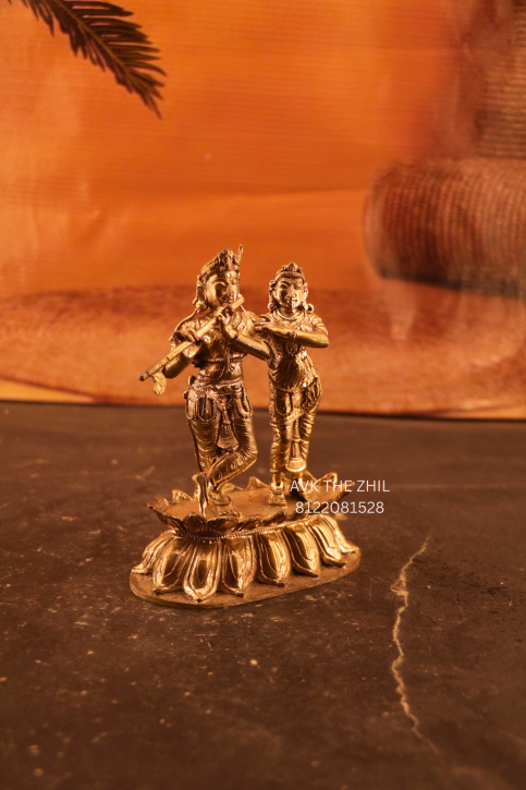 A finely crafted brass statue depicting Lord Krishna with Radha, captured in a graceful pose where Krishna plays the flute and Radha stands beside him in divine harmony. This idol symbolizes eternal love, devotion, and spiritual bliss, making it ideal for pooja rooms, home décor, and gifting purposes.