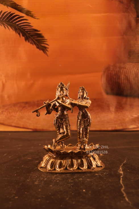 This elegant Krishna–Radha brass idol showcases intricate detailing and traditional craftsmanship. Lord Krishna is portrayed playing the flute, representing divine music and universal love, while Radha stands lovingly beside him, symbolizing devotion and soul connection. The statue is finished in a rich antique gold tone, enhancing its spiritual and aesthetic appeal. Compact in size yet visually striking, it fits perfectly on altars, shelves, office desks, or decorative corners. Suitable for daily worship, festive occasions, and auspicious gifts like weddings, housewarmings, and anniversaries.