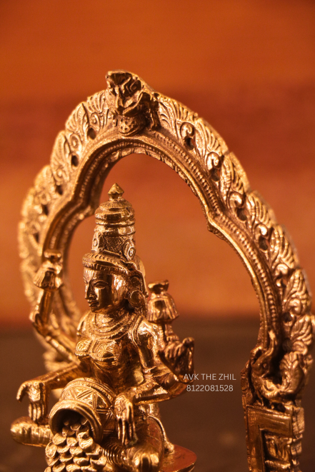 A finely crafted brass Lakshmi idol depicting Goddess Lakshmi seated gracefully under an ornate arch, symbolizing wealth, prosperity, and divine blessings. This traditional sculpture is ideal for home pooja rooms, offices, and spiritual décor.