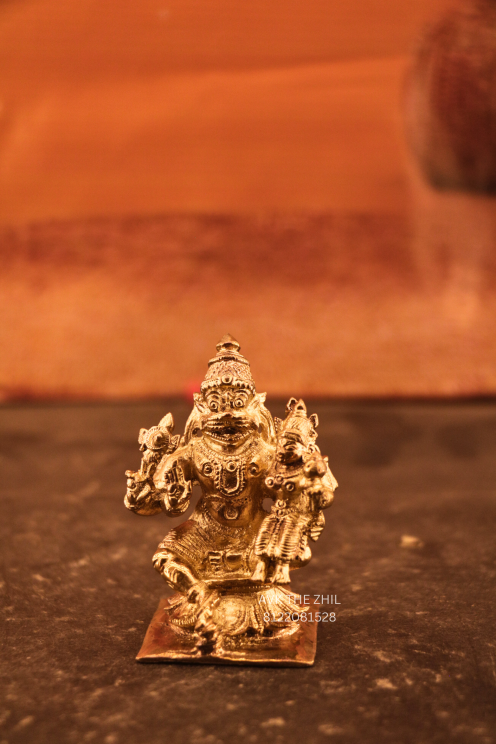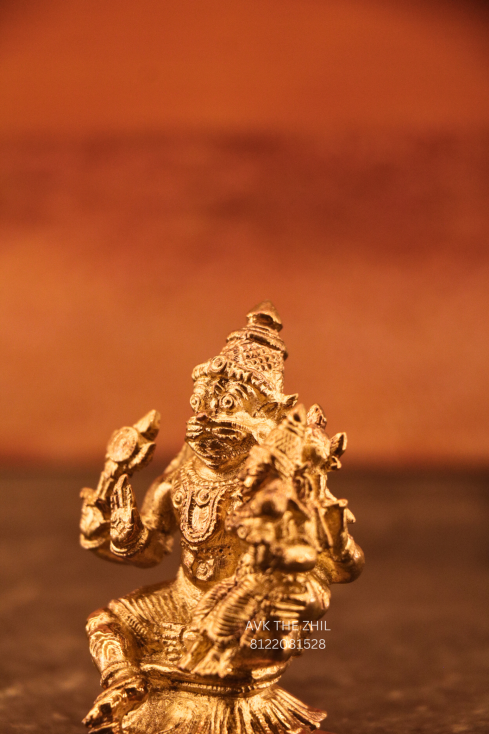A finely crafted Lakshmi Narasimhar idol, made with detailed workmanship, representing the divine form of Lord Narasimha with Goddess Lakshmi, symbolizing protection, prosperity, and spiritual strength.
