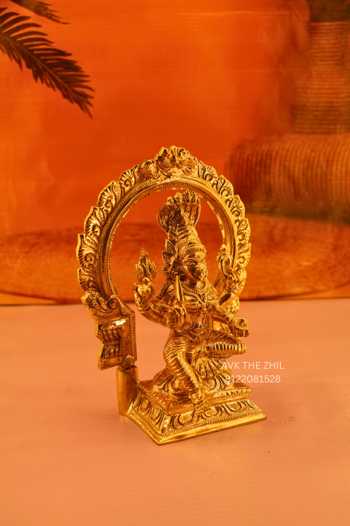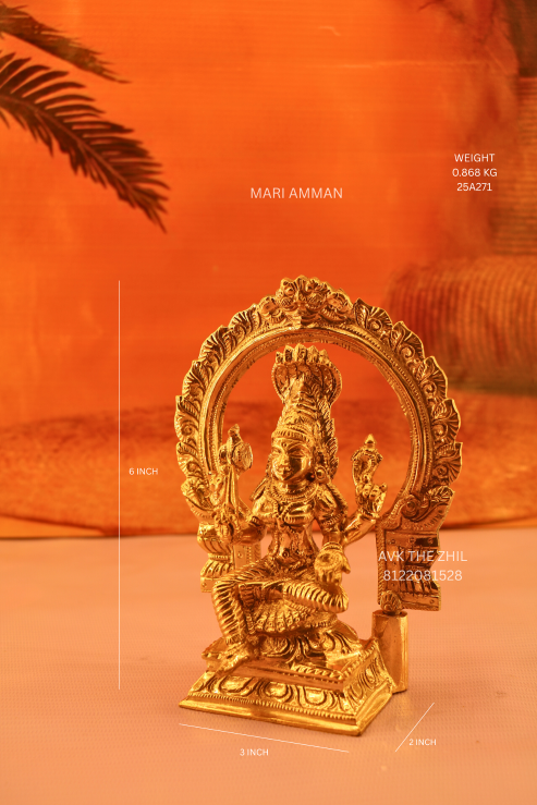 This finely crafted Mari Amman idol is made with detailed traditional workmanship, reflecting divine grace and strength. The goddess is depicted in a seated posture with sacred ornaments and a beautifully carved arch (prabhavali), symbolizing her divine presence and protection.
