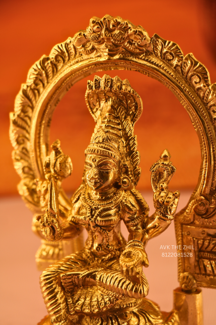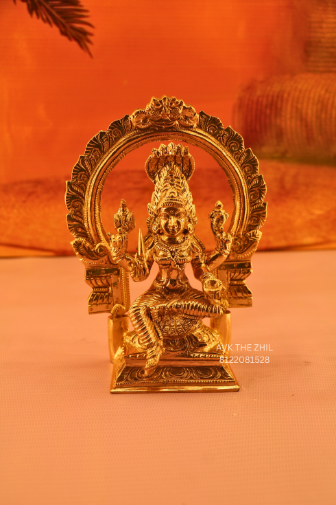 The idol has a height of 6 inches, a base width of 3 inches, and a depth of 2 inches, making it ideal for home pooja rooms, temples, and spiritual décor. With a weight of approximately 0.868 kg, it has a solid and premium feel. The golden finish enhances its divine appearance and traditional aesthetic.