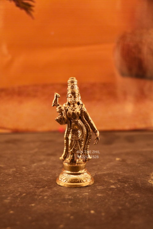 This image shows a finely crafted Meenakshi Amman brass idol, designed with traditional South Indian temple artistry. The idol is compact in size, detailed in ornamentation, and suitable for home pooja, gifting, or decorative spiritual use.