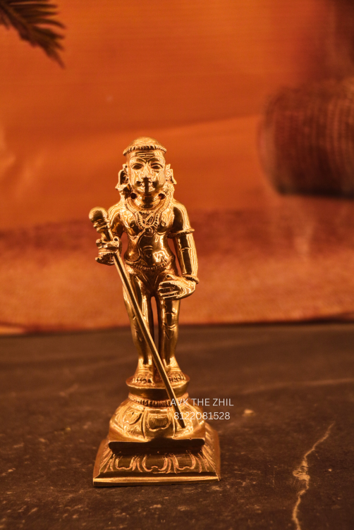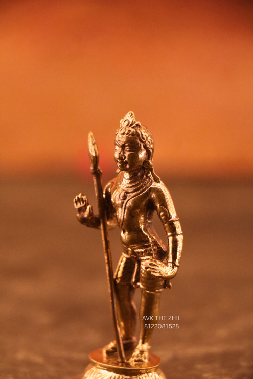 This elegant Lord Murugan (Murugan Swamy) idol is a beautifully detailed miniature sculpture standing 3.5 inches tall. The idol depicts Lord Murugan holding the Vel (spear), symbolizing wisdom, courage, and divine protection.