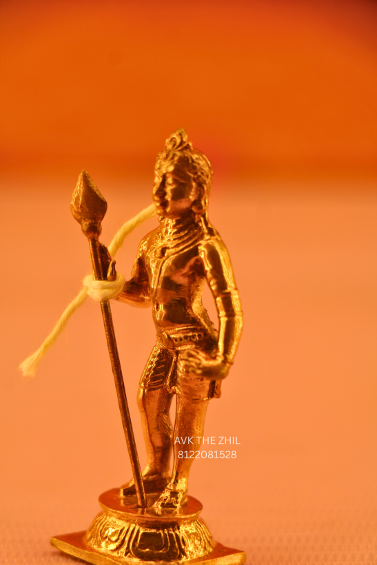 The image features a beautifully detailed Bala Murugan statue placed against a warm studio-style background that enhances its golden shine. The idol stands at approximately 2.5 inches in height with a compact, sturdy base, making it ideal for home altars, pooja rooms, workspaces, or as a spiritual gift.