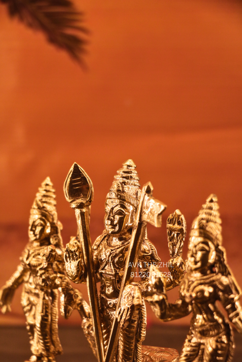 The image showcases an elegant Murugan idol with his divine attendants, beautifully sculpted with intricate detailing and a rich gold polish. The statue reflects traditional South Indian craftsmanship and devotion, making it ideal for pooja rooms, temples, and sacred spaces.