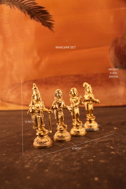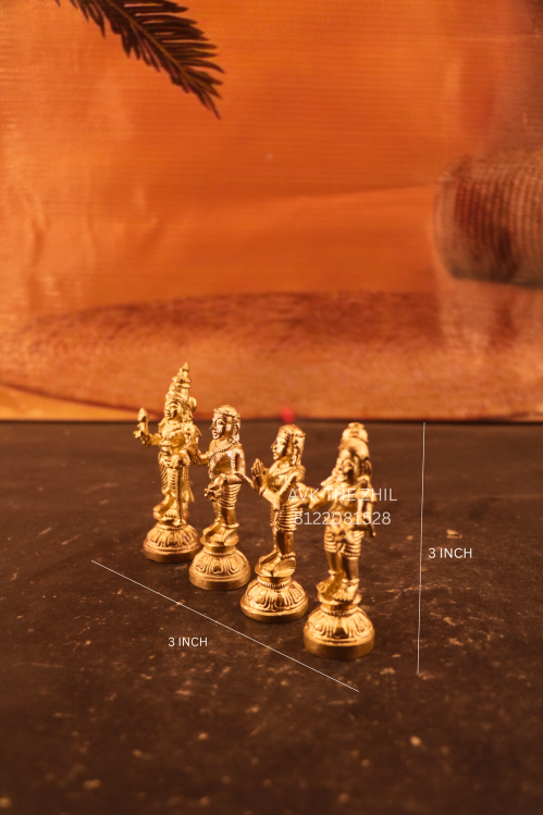 A finely crafted set of miniature brass idols depicting Lord Rama, Goddess Sita, Lord Lakshmana, and Lord Hanuman, designed in traditional South Indian style and ideal for home pooja, temples, and devotional decor.