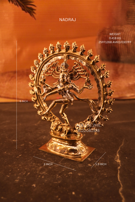 Nataraja is a sacred representation of Lord Shiva as the cosmic dancer, symbolizing the eternal cycle of creation, preservation, and destruction. This finely crafted idol captures the divine energy and rhythmic movement of Shiva in his Ananda Tandava (dance of bliss).