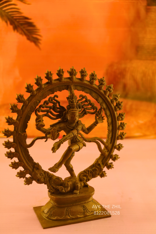 A beautifully detailed Nataraja brass idol, showcasing Lord Shiva in his iconic dancing posture within a circular flame arch. The sculpture reflects exquisite craftsmanship with intricate carvings on the arch, posture, and base. Its antique brass finish adds a timeless devotional appeal. Compact yet elegant, this idol is perfect for daily worship, meditation spaces, offices, or as a sacred gift for special occasions and festivals.