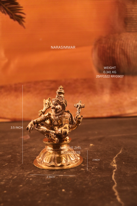 This beautifully sculpted Lord Narasimhar brass idol represents divine power, protection, and righteousness. Made from high-quality brass, the idol features detailed facial expressions, traditional ornaments, and a stable pedestal base. Its polished antique finish enhances its spiritual and aesthetic appeal.