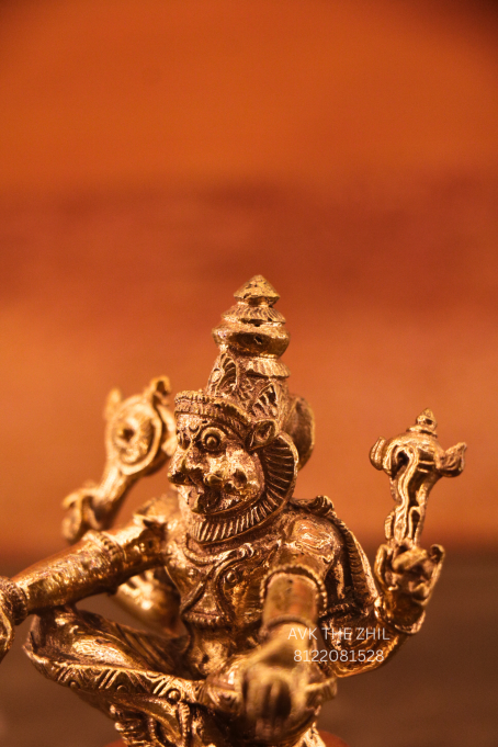 This image showcases a finely crafted Brass Narasimhar Idol, depicting Lord Narasimha—an incarnation of Lord Vishnu—designed with intricate detailing and traditional South Indian craftsmanship. The statue is compact, sturdy, and ideal for worship, decoration, or gifting.