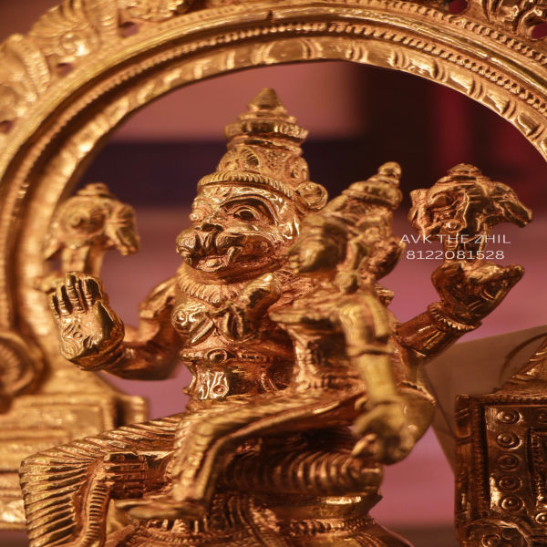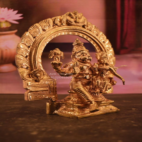 The image shows a beautifully crafted Panchaloga Narasimhar idol placed against a warm, decorative background.