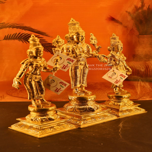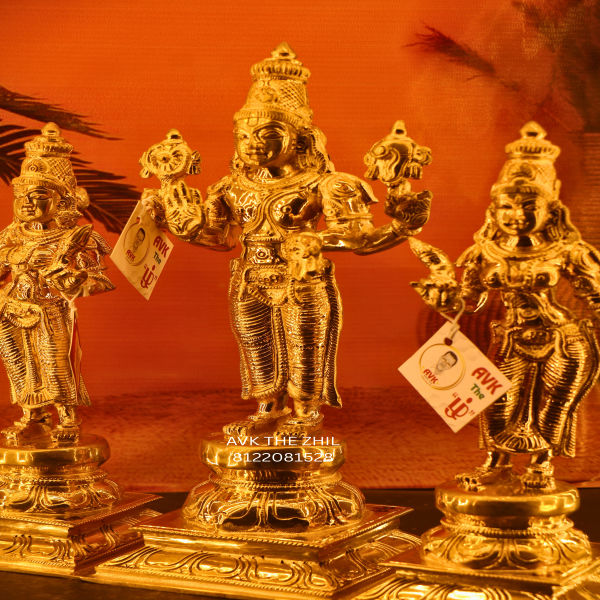 Lord Perumal, the central deity in the set, is the Protector and Preserver of the Universe according to Hindu belief. He stands gracefully holding his divine weapons — the Shankha (conch) and Chakra (discus) — which signify purity and the destruction of evil. His serene expression radiates compassion, while his ornate crown and jewelry represent divine majesty.