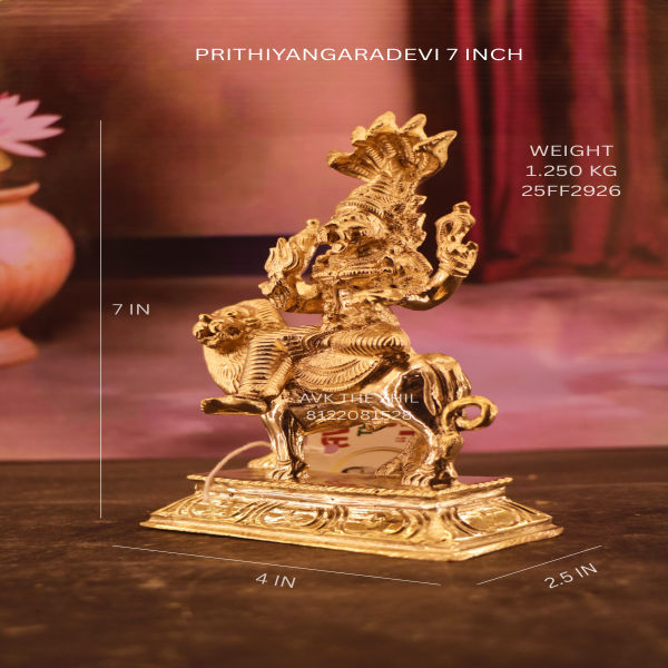 The image shows a beautiful metallic idol of Prithiyangaradevi. The idol is designed in a golden finish and is 7 inches in height. The goddess is seated on a majestically sculpted lion, symbolizing strength and protection. The statue is placed on a decorative pedestal base.