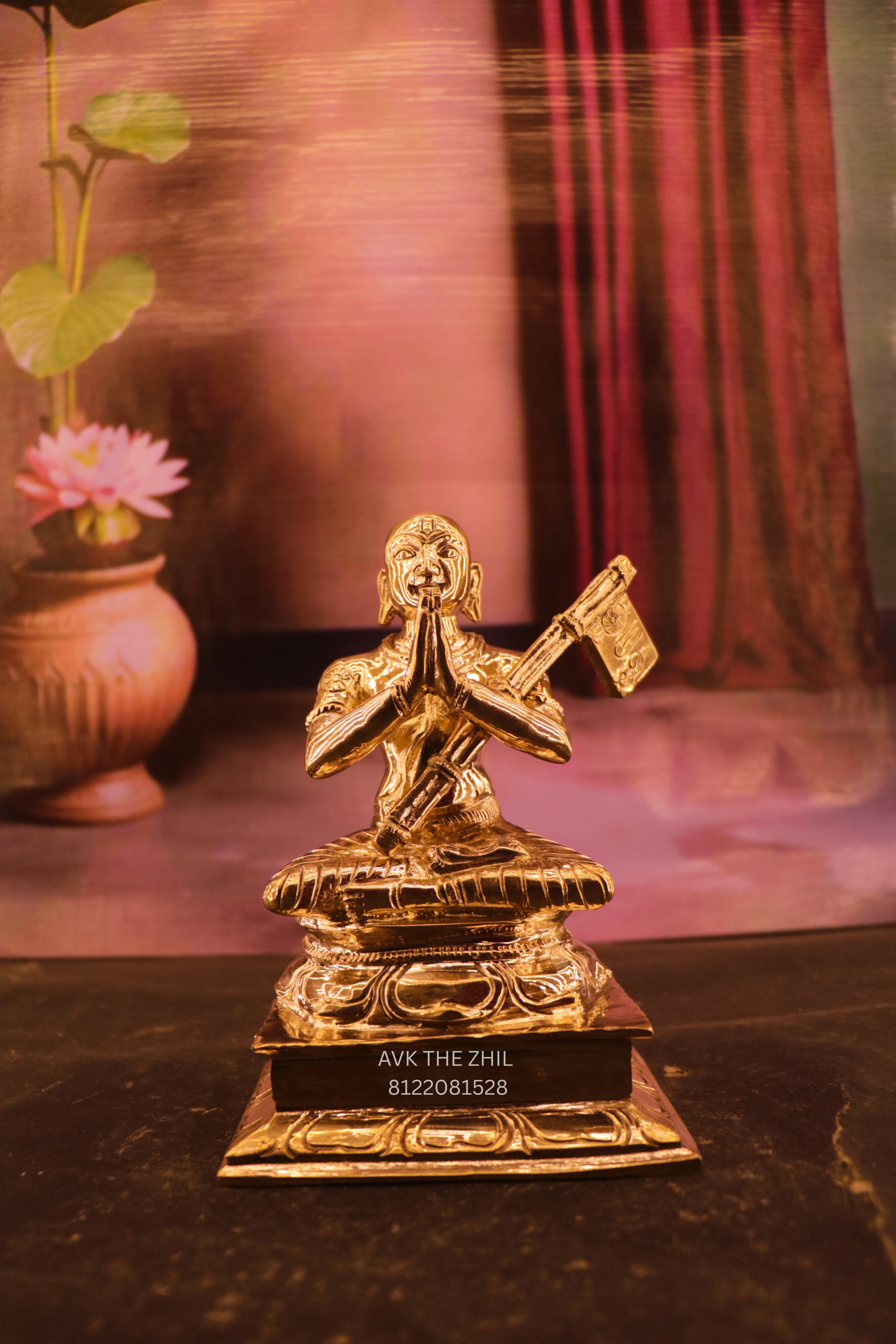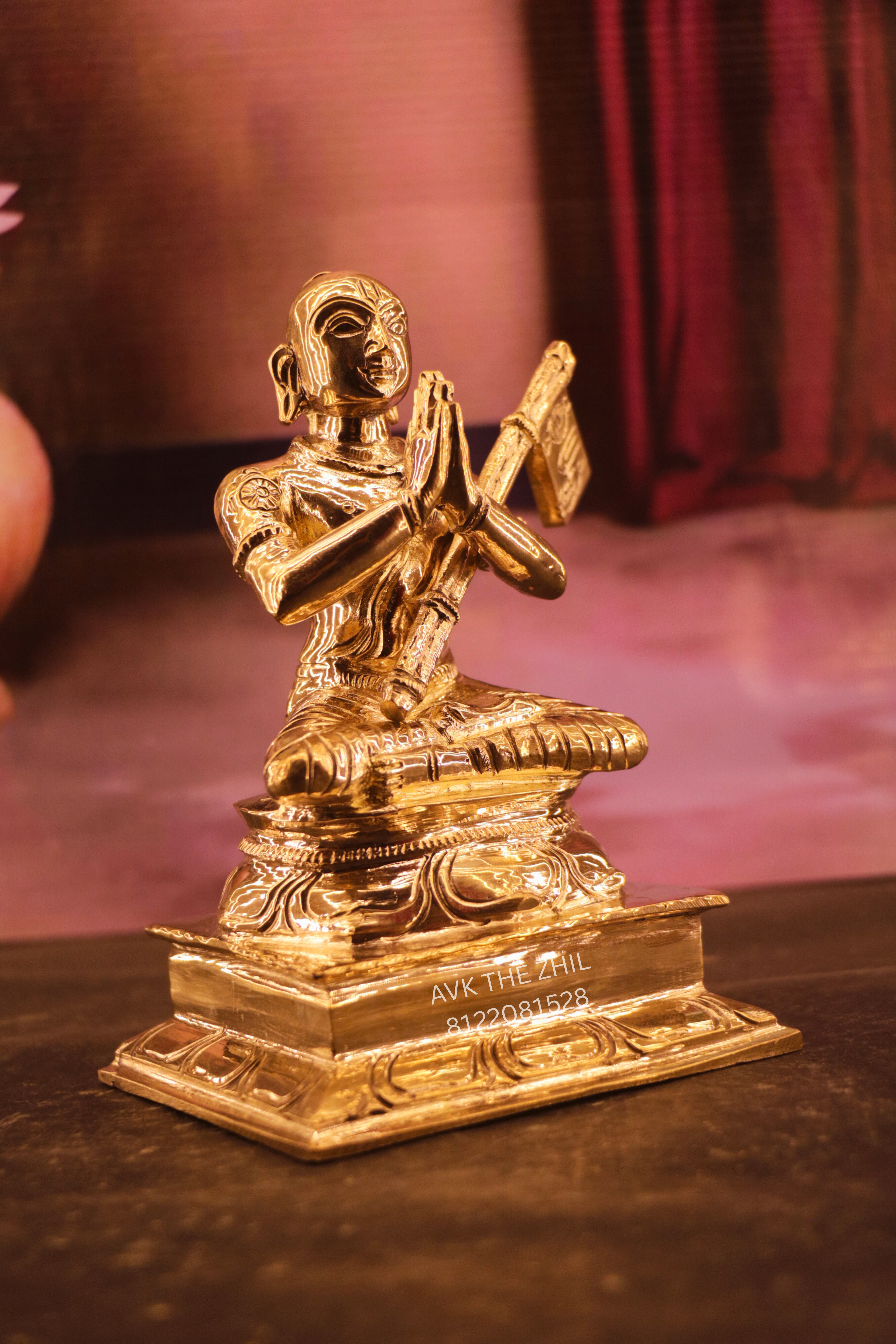 He holds a staff and flag, representing ascetic discipline and the Sri Vaishnava tradition.
