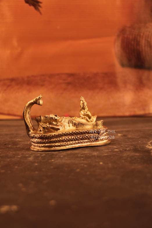This image shows a finely crafted miniature Ranganadhar (Lord Vishnu reclining on Adi Shesha) idol made of metal with a golden finish. The idol is detailed with precise proportions and is suitable for religious worship, home décor, or gifting purposes.