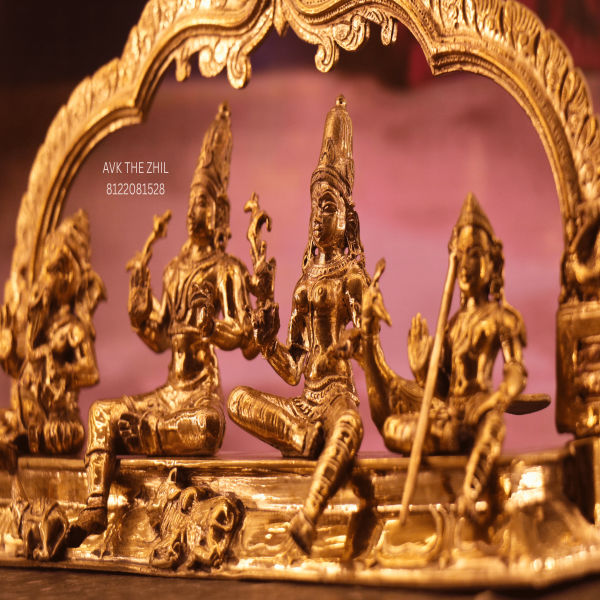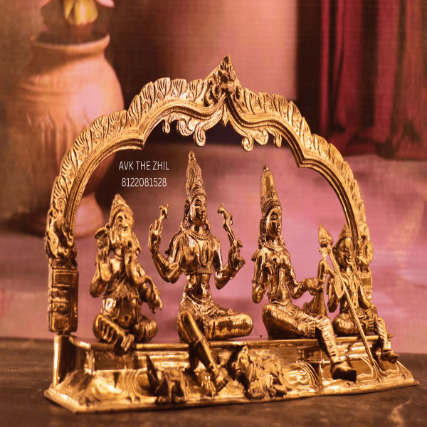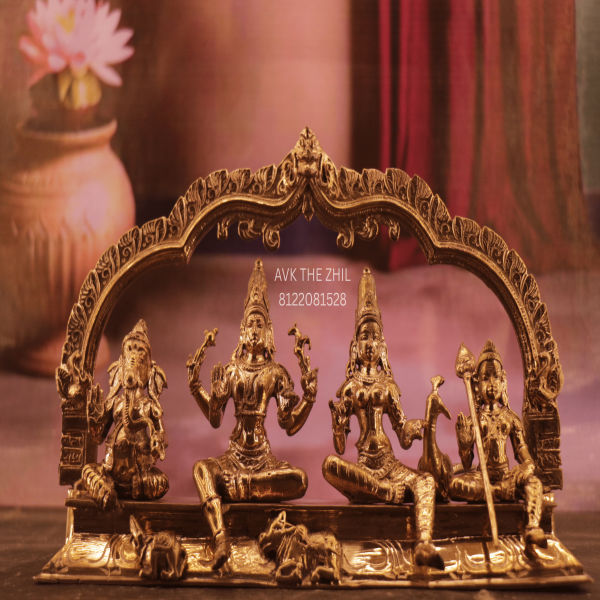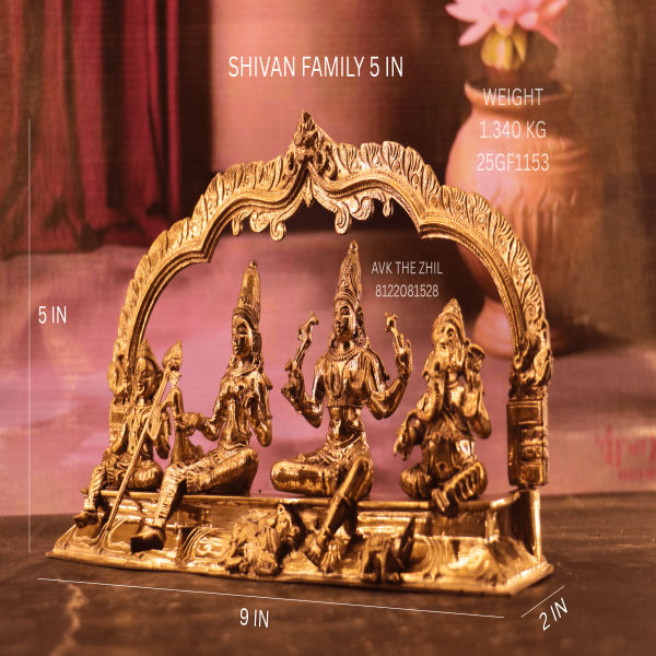 This is a beautifully crafted Shivan Family brass statue set, depicting Lord Shiva, Goddess Parvati, and their sons Lord Ganesha and Lord Murugan, seated together under an ornamental arch. The sculpture represents divine unity, protection, prosperity, and family harmony.