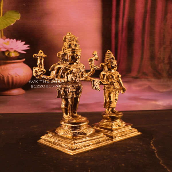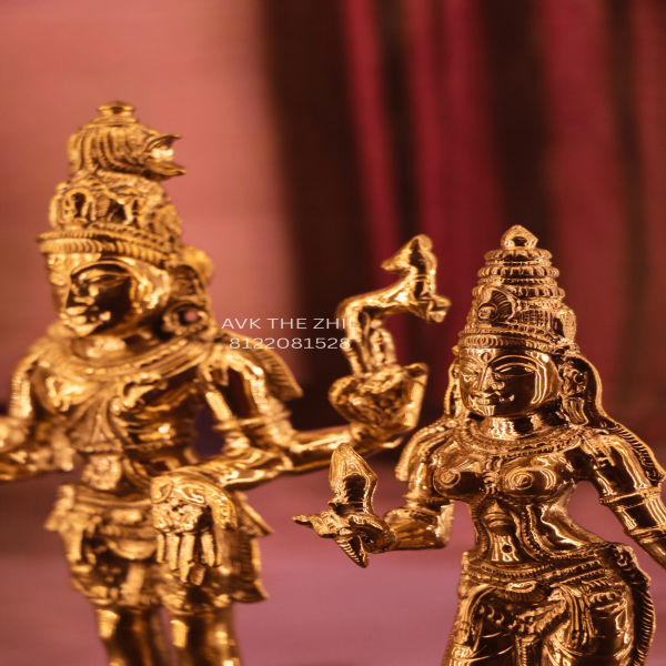 The Shivan Parvathi Set is a beautifully crafted pair of brass idols representing Lord Shiva and Goddess Parvathi, symbolizing divine union, harmony, strength, and prosperity. Each statue stands with intricate detailing, showcasing traditional South Indian artistic style.