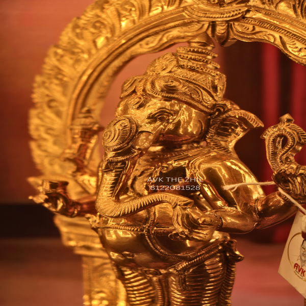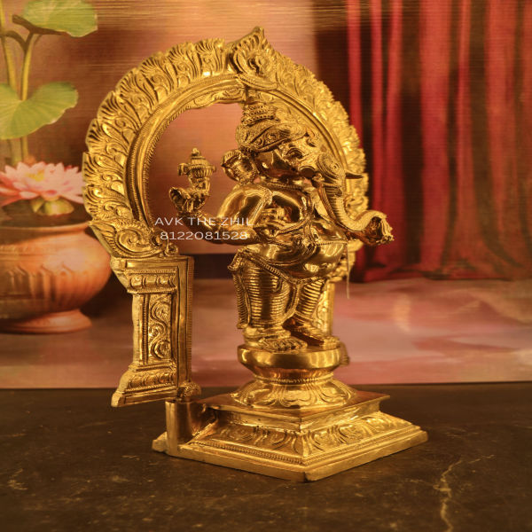 The image shows a beautifully crafted Standing Vinayagar (Lord Ganesha) brass idol that stands 13 inches tall. The idol has intricate carvings and fine detailing, with Vinayagar depicted in a standing posture holding his traditional attributes. The arch behind the idol is artistically designed with ornamental patterns, adding grandeur to the sculpture. The base is broad and stable, measuring 9 inches in length and 4 inches in width. The brass material gives the idol a polished golden shine, symbolizing divinity and prosperity.