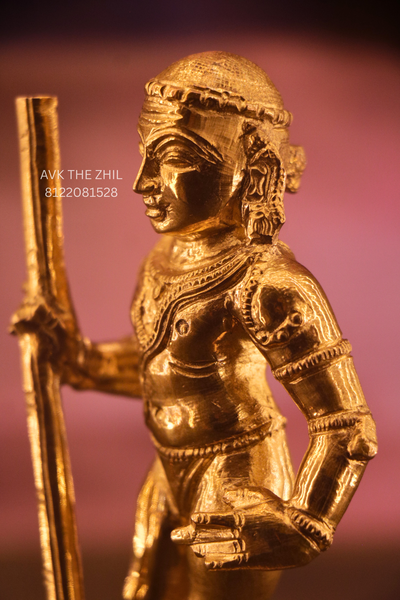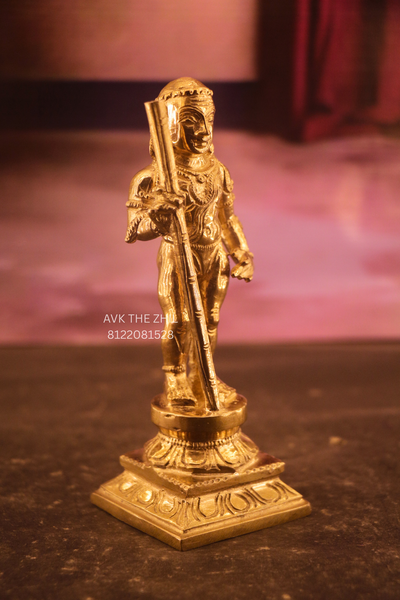 The idol portrays Lord Murugan in a standing posture, holding the sacred Vel—a symbol of protection, victory over negativity, and spiritual strength. His facial features, ornaments, and attire are intricately carved, showcasing the skill of the artisan. The brass material gives it a golden glow, making it stand out beautifully in pooja rooms and shelves.
