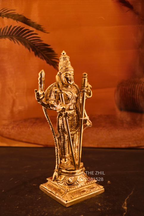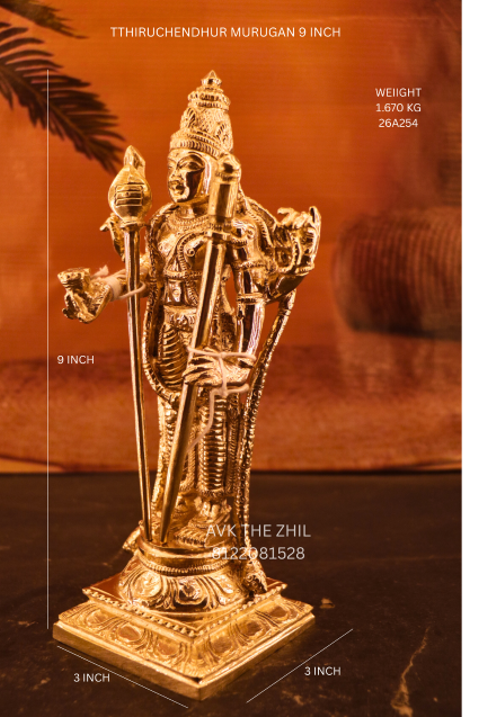 This image features a finely crafted Thiruchendur Murugan brass idol (9 inches), representing Lord Murugan in a traditional standing posture. The idol reflects divine grace, strength, and spiritual protection, inspired by the sacred Thiruchendur Murugan temple.