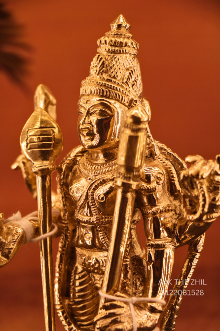 The Thiruchendur Murugan idol is beautifully sculpted with intricate detailing, showcasing Lord Murugan holding the Vel (divine spear), symbolizing wisdom and victory over evil. Made with a polished golden-brass finish, the statue stands 9 inches tall, with a stable 3 x 3 inch base, ensuring durability and elegance.