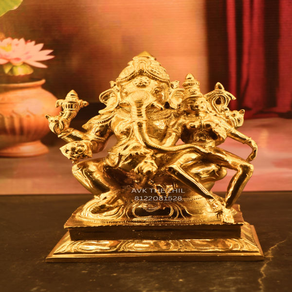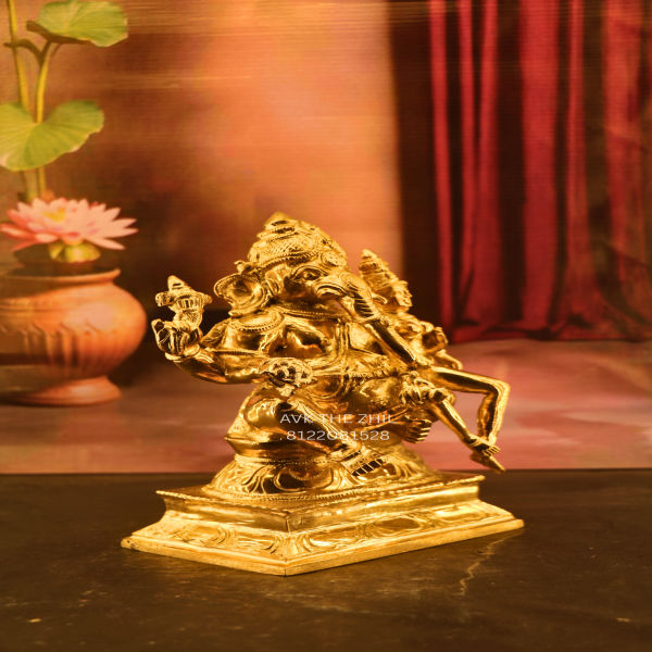 The image showcases a Panchaloha Uchishta Vinayagar idol. The sculpture is golden in color and intricately crafted with fine details. The idol measures 9 inches in height, 6 inches in width, and 4.5 inches in depth, weighing 4.000 kilograms. It is made of Panchaloha (a sacred alloy of five metals).