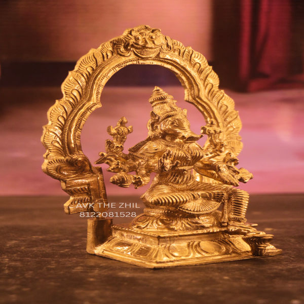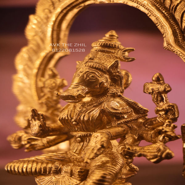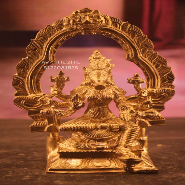 This image shows a beautifully crafted Varahi Amman brass statue designed in a seated posture. The statue features intricate detailing, including the goddess’s boar-faced form, ornate jewellery, and traditional attire. She is seated on a decorative pedestal with a grand arch-frame (Thorana) behind her, which is richly engraved with traditional patterns.