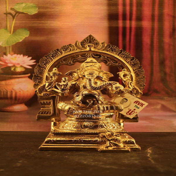 The uploaded image shows a golden statue labeled "Panchaloga Vinayagar," which is 10 inches tall. The statue measures 10 inches in height, 7 inches in width, and 5 inches in depth. It weighs 4.300 kg. The statue depicts Lord Vinayagar (also known as Ganesha), who is seated and adorned with intricate details. He is shown with multiple arms holding symbolic objects, and an ornate arch frames the figure.