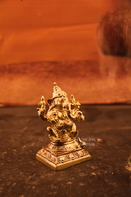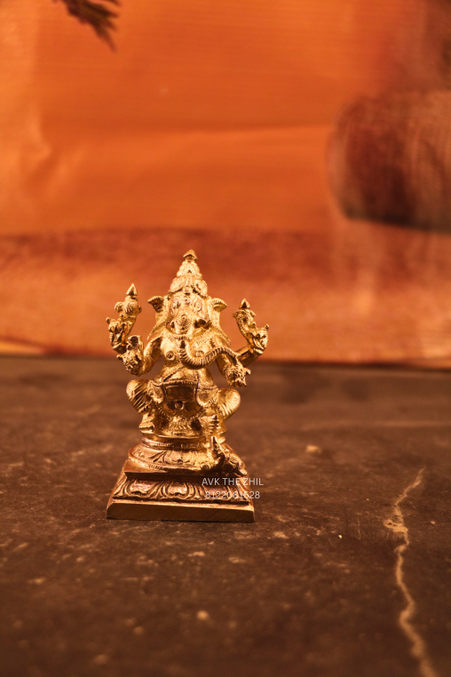 This image features a miniature Vinayagar (Lord Ganesha) idol, finely crafted in a metallic finish, designed for pooja, décor, or gifting purposes. The idol is compact in size, lightweight, and detailed with traditional iconography, making it suitable for home altars, office desks, car dashboards, or spiritual gifting.