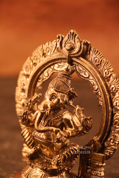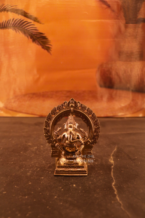 This image shows a brass Vinayagar (Lord Ganesha) idol crafted in a traditional South Indian style, seated under an ornate arch. The idol is compact, finely detailed, and suitable for home pooja, office desks, or gifting purposes.