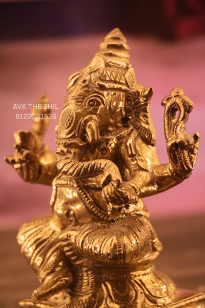 This beautifully crafted 5-inch Vinayagar (Ganesha) statue is made from high-quality brass and features intricate traditional South Indian detailing. The idol depicts Lord Vinayagar seated gracefully, holding symbolic attributes in all four hands, representing wisdom, strength, and prosperity. With its rich golden finish and detailed carvings, this statue is perfect for pooja rooms, home décor, gifting, or spiritual collections.