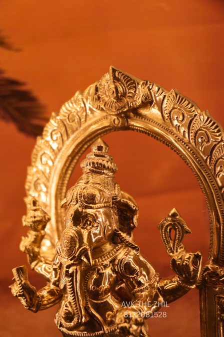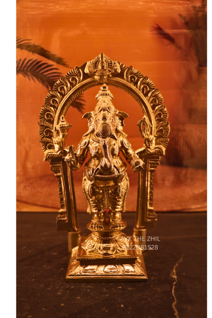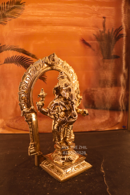 This beautifully crafted Standing Vinayagar statue is made with a rich antique gold finish, showcasing fine traditional detailing. The idol features Lord Vinayagar standing gracefully under an ornate arch (Prabhavali), symbolizing divine protection and spiritual power.
